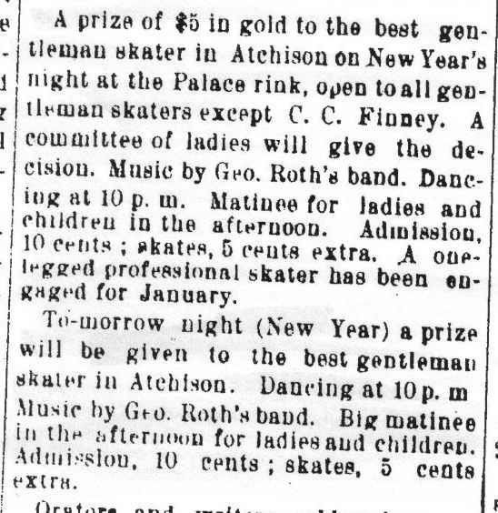 In 1882, Charles C. Finney became a bookkeeper for Dr. Dan Holland, and later his office assistant. Charles’ decision to study medicine was made at the suggestion of Dr. Holland. Charley Finney, as he was called in the papers, was also an accomplished figure skater. On December 27, 1883, Charley Finney and Miss Florence Guerrier won gold medals for best couple skaters. For some reason, Charley fell out of favor in the sport and in 1885, was barred from participating in a competition (see news clipping below). In his obituary, he was described as an expert skater who frequently dressed as a female and appeared on the ice billed as “Miss Colby of Baltimore,” skating so gracefully that few spectators knew his identity as a man.